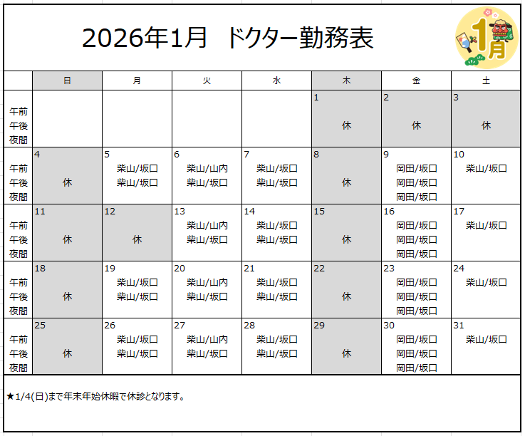 2026年1月9日 お知らせ 【修正】1月ドクター勤務表 平素は当院をご利用頂き、誠にありがとうございます。 1月のドクター勤務表です。 ★1/4(日)まで年末年始休暇で休診となります。 バセドウ病の治療 優先席設置のお知らせ