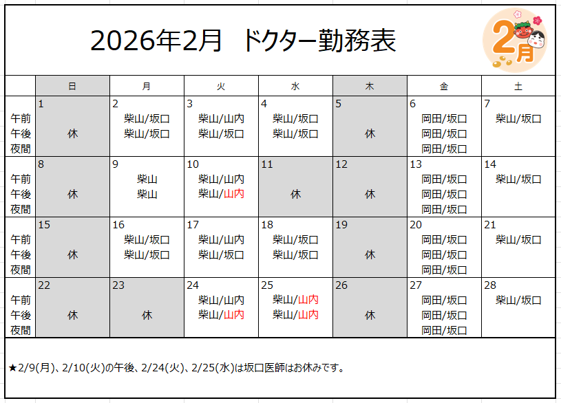 2026年2月9日 お知らせ 【修正】2月ドクター勤務表 平素は当院をご利用頂き、誠にありがとうございます。 2月のドクター勤務表です。★2/9(月)、2/10(火)の午後、2/24(火)、2/25(水)は坂口医師はお休みです。 バセドウ病と妊娠・出産・授乳