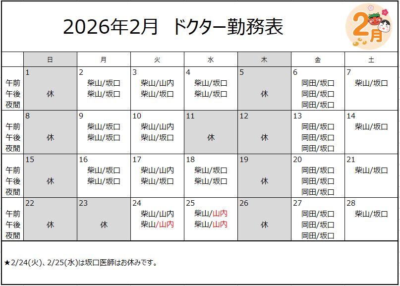 ★2/24(火)、2/25(水)は坂口医師はお休みです。